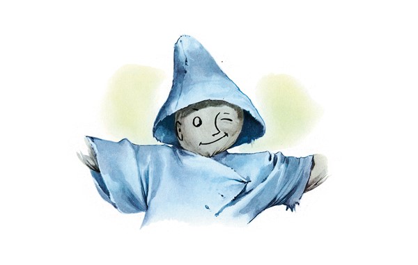 Дороти стала разглядывать пугало. Его голова представляла собой мешочек, набитый соломой, на котором краской были выведены глаза, нос и рот, так что получилось лицо. На голове у него была голубая остроконечная шляпа. Одето чучело было в голубой и весьма поношенный костюм, набитый соломой, а обуто в голубые сапоги с широкими отворотами, какие носили все Жевуны. Это был очень неплохо сделанный Страшила.