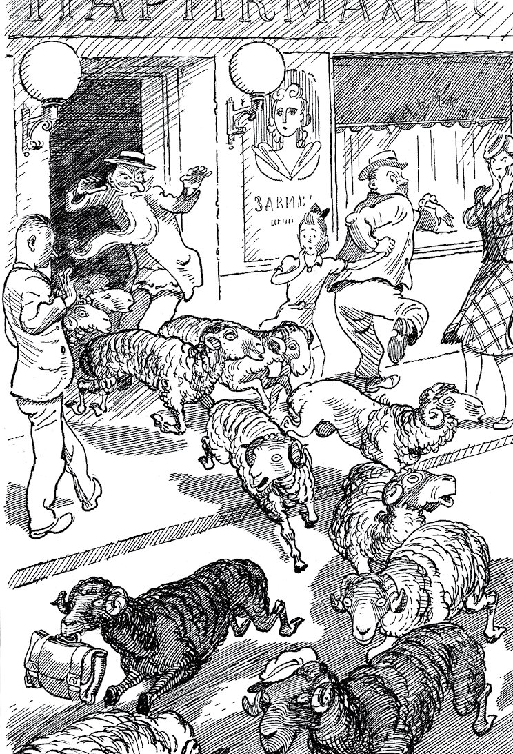 Через полминуты из дверей парикмахерской выбежали, дробно цокая копытцами, девятнадцать громко блеявших баранов.