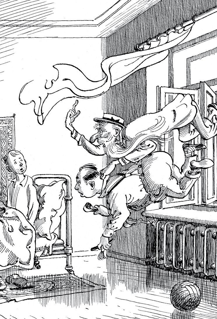 На новой квартире дым стоял коромыслом. Мебель была расставлена кое-как, на диване лежала куча всякой одежды, которая почему-то никак не влезала в шкаф. Столовая была загромождена ящиками с книгами и всякой домашней утварью. Бабушка вместе с матерью стряпала ужин для отца, который только недавно вернулся с работы и с места в карь-ер принялся вколачивать в стенки гвозди для портретов. Словом, у взрослых было столько забот, что они не имели никакой возможности присмотреться к тому, как выглядят Волькины щеки. Наспех отругав его за «полуночничание», они вновь занялись своими делами. А Волька, которому пережитое за день основательно отшибло аппетит, отказался от ужина и, сказавшись усталым, завалился спать. Он лежал один в своей темной комнате. Время от времени он щупал свои бритые щеки и горестно стонал. А в это время было слышно, как за стеной отец, развесив наконец портреты, начал распаковывать ящики с книгами. Потом донеслись голоса бабушки, матери, звон посуды, ножей и вилок, прекратился стук молотка и скрежет открываемых ящиков: родители сели ужинать.