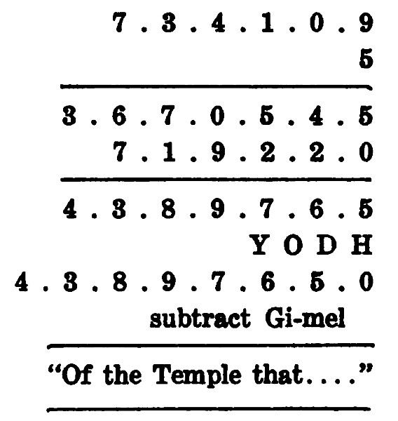 He started with the ordinary numerical values of the Hebrew alphabet. They were 7.3.4.1.0.9. which meant: Za-yin, Gi-mel, Da-leth, A-leph, the zero, and Teth. These were multiplied by He, which meant 5. Then 719220, meaning certain other letters, were added and multiplied by yodh, or ten. From each number of the total 3, or Gi-mel, was subtracted, and the English translation of the figures that remained was: “of the Temple that – ”