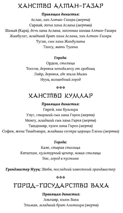 – Я на самом деле жила во дворце в Алтан-Газаре и служила принцессе Шамай. Когда ханом стал Жанбулат, мне пришлось покинуть страну. Во время скитаний я познакомилась с Дэмиром, который обучил меня боевым искусствам. Принц Вэйдун нанял нас, чтобы мы помогли Баифану противостоять алтан-газарцам.