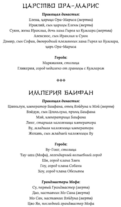 Цанрен действовали тихо и незаметно, точно призраки: они выискивали секретные сведения и подбирались к людям, к которым, казалось бы, невозможно подобраться. Так же тихо они убивали – вот живет человек, а на следующий день его будто и не существовало. Раньше я не знала, что в Баифане существует подобное подразделение. Судя по рассказам Вэйдуна и Мэй, эти шпионы были чуть ли не сверхлюдьми. Я даже спросила, не обладают ли они способностями, на что мне ответили, что специализирующиеся на техниках рукопашного боя и скрытом оружии цанрен страшны и без того. В общем, если кто и должен был заниматься поисками Дэмира, так это они.