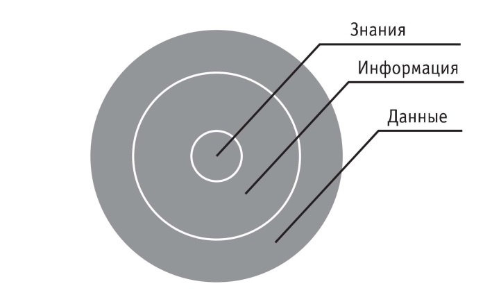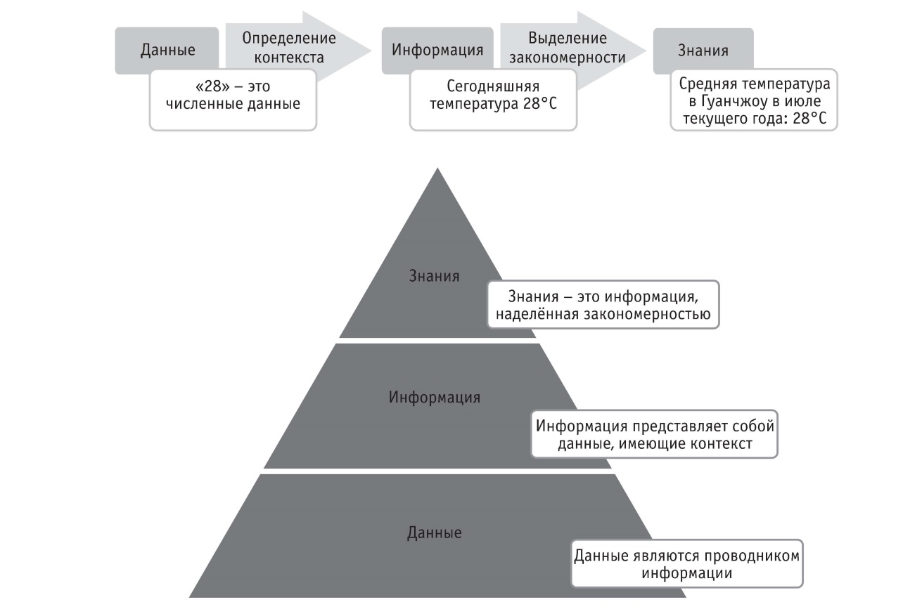Как показано на схеме 1.2, в традиционном понимании, «данные», «информация» и «знания» – это совершенно разные понятия. Данные являются проводником информации, информация представляет собой данные с контекстом, а знания – это конечная информация, обладающая закономерностями, полученными в результате произведённых человеком обобщения и упорядочивания.