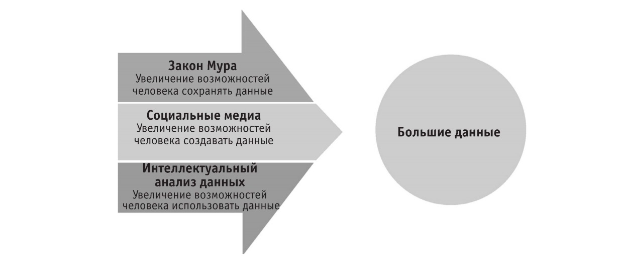 Оглядываясь на более чем полувековую историю информационного общества, отметим, что материальный базис феномена больших данных был заложен только благодаря непрекращающемуся уменьшению размеров транзисторов и снижению их себестоимости, в результате чего у людей появилась возможность создать колоссальное, подобное огромному литому сосуду, хранилище для огромного массива данных. Технология же интеллектуального анализа данных, расцвет которой начался в 1989 году, сопоставима с технологией перегонки сырой нефти в готовый продукт: она является ключом к тому, чтобы большие данные произвели «большую ценность», без этой технологии, насколько огромен бы ни был массив данных, мы могли бы только «глядеть на нефть и бессильно вздыхать». Появившиеся в 2004 году социальные медиа, в свою очередь, сделали каждого из нас потенциальным создателем данных, который вносит свою лепту в наполнение отлитого вследствие действия закона Мура «сосуд», что и является главным фактором формирования «большого объёма». Схематично совокупность описанных факторов показана на рисунке 1.7.