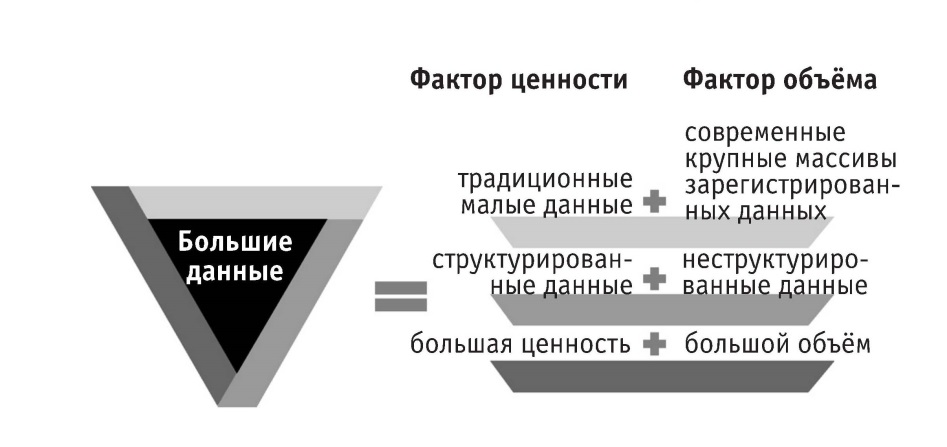 Как мы уже говорили выше, в настоящее время 75 % производимых человеком данных – это данные неструктурированные, и именно в форме неструктурированных данных воплощаются крупные массивы зарегистрированных данных. Если мы хотим обнаружить ценность крупных массивов зарегистрированных данных и неструктурированных данных, главный способ обработки их в настоящее время – это всё же преобразование их в строго структурированные, то есть традиционные малые данные. Поэтому, по мнению автора, ценность больших данных главным образом заключается в малых данных и структурированных данных, а их объёмность – прежде всего в существующих в настоящее время крупных массивах зарегистрированных данных и в неструктурированных данных.