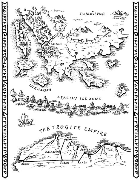 ‘It’s fairly certain that the creatures of the Wasteland will come east now, Dahlaine,’ Aracia was saying as Red-Beard and Longbow entered Veltan’s map-room. ‘After Yaltar’s volcano destroyed the ones in Zelana’s Domain, they turned south to attack the nearest part of the Land of Dhrall, and east is closer to south than north. They’ll attack me next. That should be obvious.’
