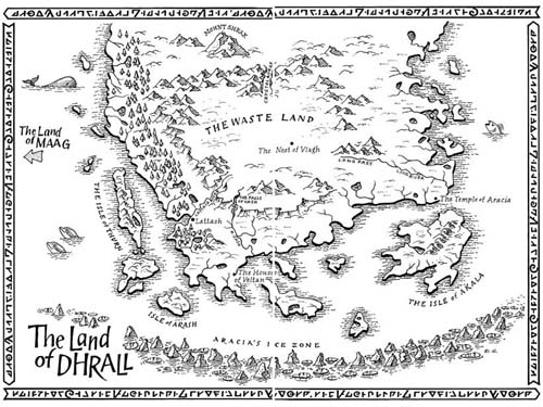 Now the gods of the land of Dhrall have divided the land, and each, younger or elder, holds dominion over a certain portion of the land. There remains, however, a vast Wasteland in the center that is not part of any of the four Domains, be they East or West, North or South, for the Wasteland of Dhrall is barren and without beauty. There is life there, however, but the life-forms of the Wasteland are unlike those of the rest of the Land of Dhrall. The legends of Dhrall maintain that the life-forms of the Wasteland are the creations of That-Called-the-Vlagh.