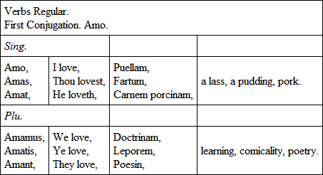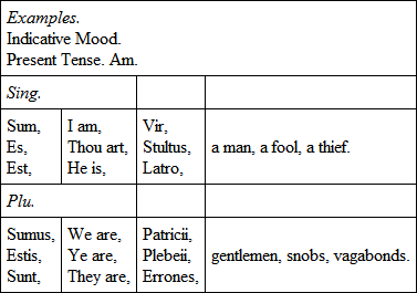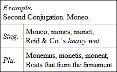 But “revenons à nos moutons,” that is, let us get back to our verbs. We recommend the most attentive and diligent study of all of them as set forth in the Eton Grammar, assisted by that kind of association of ideas, of which we shall now proceed to give a few specimens.