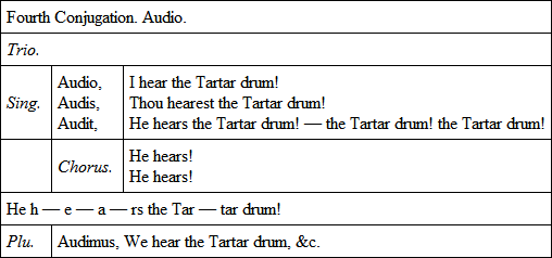 Rule 3. Should you be desired to give the English of each person in the tense which you are repeating, you may (we mean a class of you), follow a plan adopted with great success and striking effect in that kind of dramatic representation entitled “A Grand Opera,” that of singing what you have to say. Hold up your head, turn out your toes, clear your voices, and begin. A-hem!