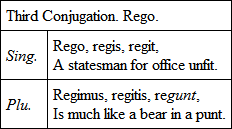 Rule 2. In repeating the different tenses of verbs, be careful to be provided with a short English verse, contrived so as to rhyme with the third person singular, and another to rhyme with the third person plural. In this way your powers of composition as well as of memory will be profitably exercised.