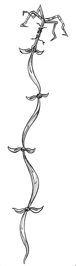 Материалов у нее под рукой было для этого очень мало, а ходить ночью по дому в поисках чего-то подходящего с риском возбудить подозрения Графа Олафа и его шайки она не решалась. Но все-таки кое-какие детали для создания спасательного устройства у нее нашлись. Над окном оставался крепкий металлический прут, на котором раньше висела штора. Вайолет ухитрилась снять его. С помощью одного из булыжников, положенных в комнате Графом Олафом, она разломила прут надвое. Каждый кусок она несколько раз согнула под острым углом (и при этом слегка порезала себе ладони). Потом она сняла со стенки одно изображение глаза, висевшее, как водится, на проволочной петельке. Отцепила проволочку и соединила с ее помощью два куска прута. Получилось нечто вроде большого металлического паука.