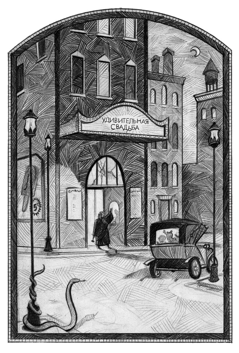 На этом месте я вынужден прервать свой рассказ и объявить последнее предупреждение. Как я уже говорил в самом начале: у книги, которую вы держите сейчас в руках, не будет хорошего конца. Вы можете подумать, будто Граф Олаф отправится в тюрьму и с этого дня трое бодлеровских детей заживут счастливой жизнью у судьи Штраус. Но это не так. Еще не поздно сразу же закрыть книгу и не читать дальше, до самого несчастливого конца. Вы можете всю вашу остальную жизнь считать, что бодлеровские дети восторжествовали над Графом Олафом и в дальнейшем блаженствовали в доме и библиотеке судьи Штраус. На самом-то деле история эта разворачивалась совсем по-другому. В то время как все смеялись над криком Солнышка, потребовавшей кекса, внушительного вида мужчина с бородавками на лице незаметно проскользнул к осветительному щиту. В мгновение ока он дернул главный рубильник – и все очутились в полной темноте. Немедленно поднялась всеобщая суматоха, все кричали и метались. Актеры налетали на зрителей. Мистер По схватил свою жену, приняв ее за Графа Олафа. Клаус схватил Солнышко и поднял как можно выше, чтобы ее не затоптали. Вайолет же, которая сразу сообразила, что произошло, осторожно пробралась туда, где, как ей показалось, находились выключатели. Пока шел спектакль, она внимательно наблюдала за осветительным щитом и на всякий случай запомнила расположение рукояток: вдруг они пригодятся ей для какого-нибудь полезного устройства? Она не сомневалась, что сумеет включить свет, стоит только отыскать выключатель. Вытянув руки вперед, она шла по сцене как слепая, старательно обходя предметы и испуганных актеров – в темноте Вайолет, медленно двигающаяся по сцене в своем белом свадебном платье, выглядела как привидение. В тот момент, когда она уже дотронулась до рукоятки, она ощутила руку на своем плече, и некто, нагнувшись, прошептал ей в ухо: