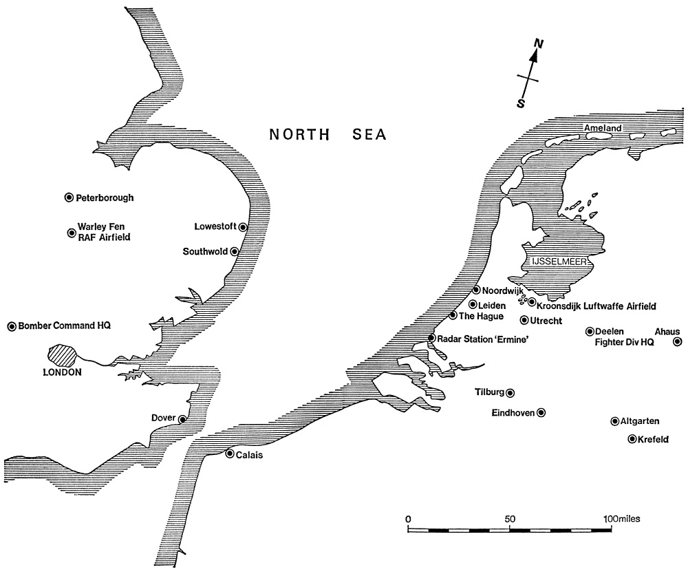 It was almost overwhelming but it was too late to stop, and anyway I enjoy research. One large room of my London home was devoted entirely to Bomber. I collected everything available: films, air photos, logbooks, letters, recordings, tele-printer orders and target maps. Pasting aeronautical maps together I covered one whole wall with northern Europe. Tapes of the bomber routes, turning-points, dog-legs and feints showed each aircraft in the story. Tabs for times meant I could see where each fighter or bomber would be at any chosen moment.