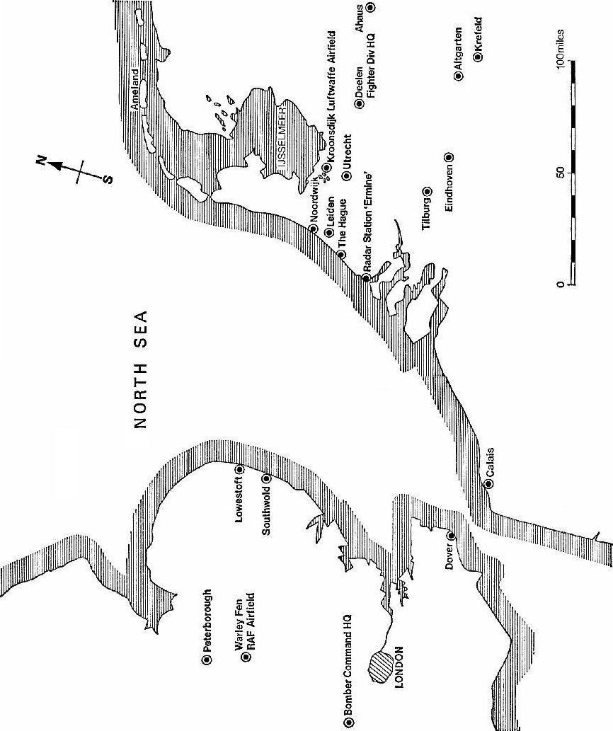 It was almost overwhelming but it was too late to stop, and anyway I enjoy research. One large room of my London home was devoted entirely to Bomber. I collected everything available: films, air photos, logbooks, letters, recordings, tele-printer orders and target maps. Pasting aeronautical maps together I covered one whole wall with northern Europe. Tapes of the bomber routes, turning-points, dog-legs and feints showed each aircraft in the story. Tabs for times meant I could see where each fighter or bomber would be at any chosen moment.