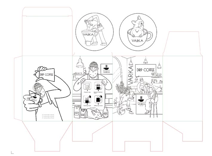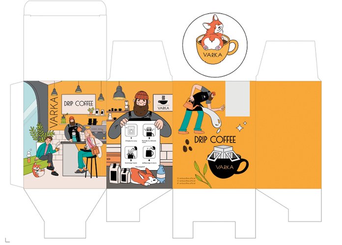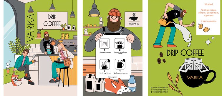 Это сеть из более 80 кофеен с посадкой и более 300 кофеен самообслуживания, и у компании уже есть довольно узнаваемый брендинг и имя на рынке. Но тем не менее им захотелось дополнить его: я разработала упаковку для дрип-кофе, и каждый сезон мы выпускаем фирменные стаканчики с иллюстрациями.