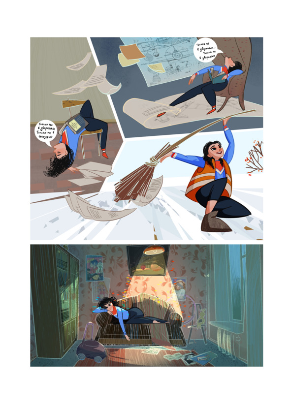 Сирин перемещалась очень быстро, открывая двери и впуская свет закатного солнца. Она подхватывала бумаги, прорываясь сквозь дрожащую и гудящую массу. Сирин летала из кабинета в кабинет, упорядочивая все нужное и выбрасывая все ненужное. Невероятным образом она точно знала, что и как делать. Движения были настолько стремительные, что казалось, будто она телепортируется из одной точки в другую. Чудище становилось меньше, а голубое сияние в коридоре усиливалось. Наконец Сирин добралась до бейджа. Она сорвала его, и взрывной волной оставшиеся бумаги разлетелись по своим местам. В воздухе под потолком парила человек-птица и худощавая женщина в очках и тускло-розовом костюме. Глаза женщины закрыты. В руках она сжимает красные корочки диплома и янтарную фигурку жирафа. От женщины тоже исходит небольшое сияние, но очень слабое, еле заметное.