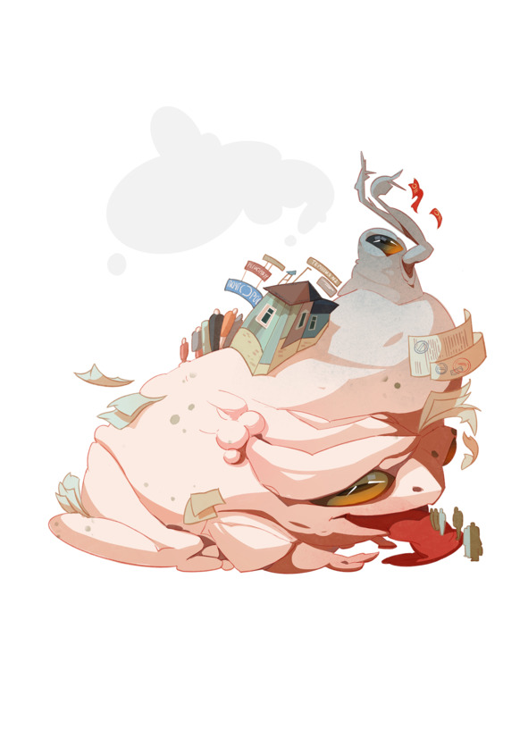 Рен уже могла разглядеть детали. Тело состояло из бумаги, вернее, из кипы бумаг. Видимо, поэтому чудище казалось таким белым. Клейкая липкая масса позволяла частям держаться вместе. Еще виднелись таблички «приемные часы», «обед», «закрыто», «перерыв 15 минут» и многое другое – скрепки, папки, файлы и печати. Ближе к середине туловища Рен заметила бейдж. На нем крупными Arial-буквами значилось «Бюрослава». На самом верху этой груды виднелись два горящих красных глаза.