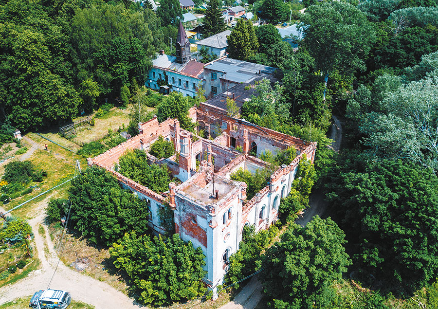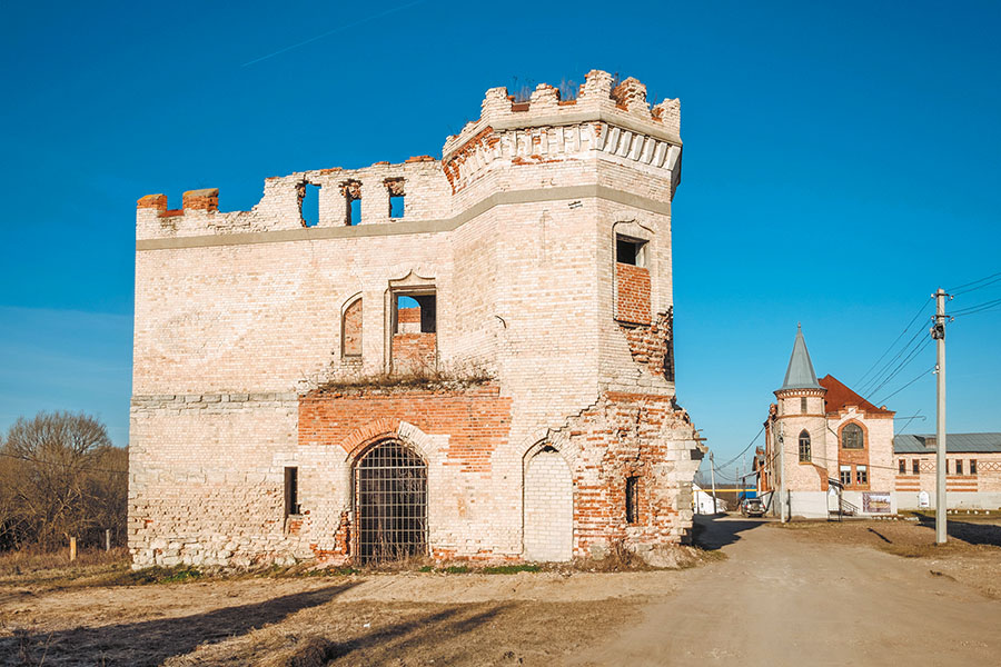 Готический замок с отдельной комнатой и прислугой для десятков кошек. Огромное хозяйство. Фонтаны, пруды, роскошные интерьеры. Все это было – но осталось в прошлом. Сейчас роскошный дворец выглядит совершенно несуразно и даже немного инородно среди обычных деревенских домиков и огородов. Пропорции нарушены, штукатурка облупилась, крыши нет. Стрельчатые окна и зубчатые стены соседствуют с прямоугольной пристройкой, явно появившейся в советское время.