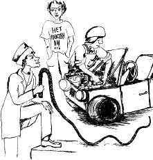 Доктору Шприцу нужно было выезжать на вызов, а машина как раз сломалась. Напильник тем временем что-то неспешно ковырял в моторе. Он выглядел усталым и невыспавшимся и делал всё как-то медленно. Все уже привыкли к угрозам Шприца и не воспринимали их всерьез. Но Барвинка, как раз проходившая по улице мимо того места, где застрял автомобиль, остановилась и своим звонким голосом, так, что услышали и другие прохожие, произнесла: