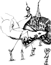 Они пошли дальше, мимо площади Путешественников, где недавно установили памятник Дирижаблю. На мраморном пьедестале стояла бронзовая гондола, в которой сидели статуи людишек. Рядом с гондолой возвышался огромный Всезнайка, держащий в руках стеклянный дирижабль, опутанный бронзовой сетью. Сеть была привязана к углам гондолы. Дирижабль и гондола были как настоящие, и людишки в гондоле – словно живые. Только Всезнайка получился раз в десять выше, чем все остальные, но так и было задумано скульптором Зубилой, которая этот памятник создала. «Дирижабль подняла сила ума», – гласила надпись на мраморном пьедестале.