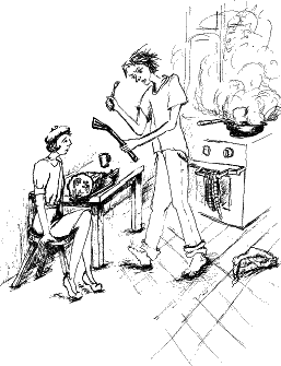 От жарящейся яичницы тем временем повалил удушливый коричневый дым. Окно, выходящее в сад, было закрыто. Кнопочка и Барвинка стали кашлять. Барвинка как будто очнулась. Она схватила сковородку, кинула ее в раковину и открыла воду. От сковородки пошел пар. Кнопочка бросилась к окну и отворила его.