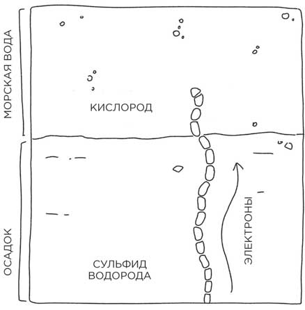 Но электрические бактерии на дне живут в грунте с очень низким содержанием кислорода. Они придумали, как справляться с этой проблемой: бактерии создают провода длиной в несколько сантиметров прямо в осадке на дне и выбираются наружу там, где есть кислород. Электроны, отобранные у молекул веществ, которые содержатся в иле на дне, проходят через этот органический провод и передаются кислороду в океане, высвобождая энергию, которая поддерживает жизнь в бактериях из провода.