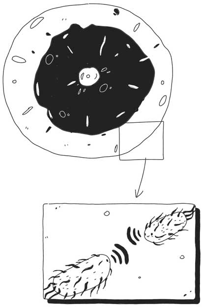 Электрические бактерииГюроль Сюэль – исследователь Калифорнийского университета в Сан-Диего, он изучает биопленки из бактерий. В последние годы взгляд на бактерии как на обособленные организмы уступил место новой интерпретации: теперь мы знаем, что они способны организовываться в сообщества, в так называемые биопленки. Эти тонкие слои, состоящие из миллиардов особей, находятся повсюду: в океане, в нашем водопроводе, на листьях деревьев и даже на зубах в виде налета[10]. Сообща бактериям проще противостоять враждебной среде с помощью разделения труда: бактерии на поверхности выполняют функции защиты, а бактерии под ней берут на себя питание. Но любое сообщество требует коммуникации, и в 2015 году команда во главе с Гюролем открыла, что в пределах пленки бактерии способны общаться посредством электрических импульсов.
