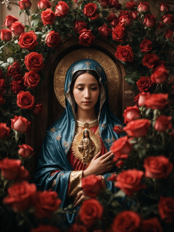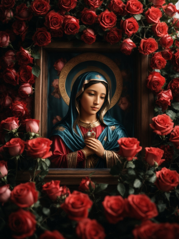 В искусстве и религиозной символике роза часто изображается как атрибут Марии, украшая ее изображения и статуи. Цветок служит напоминанием о Ее чистоте, красоте и материнской любви, отражая Ее особое место как Богородицы.
