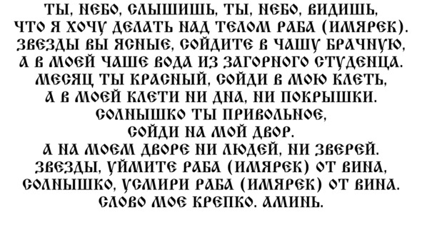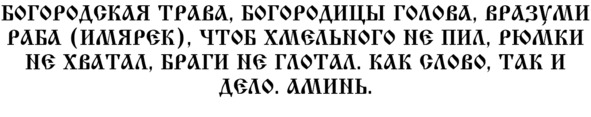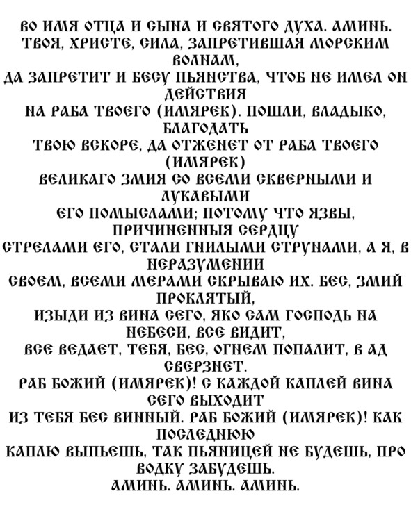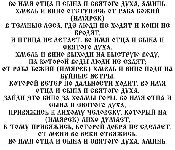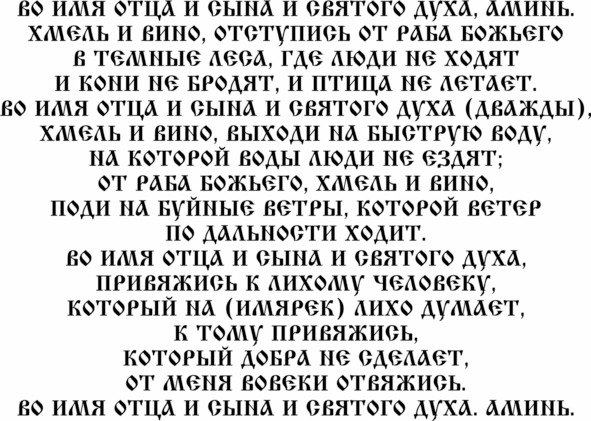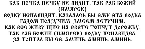 Этот заговор следует произносить тайно над алкогольными напитками, которые употребляет страдающий алкоголизмом человек, не позволяя ему узнать об этом. Необходимо прочитать заговор три раза и проследить, чтобы он выпил эти «наговоренные» напитки.