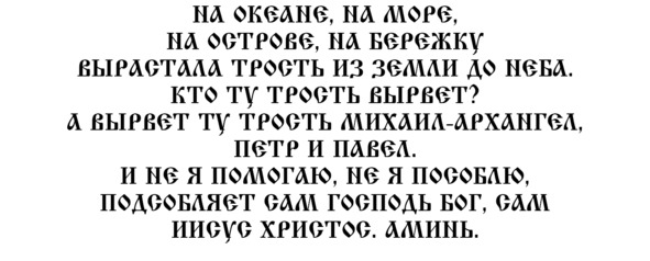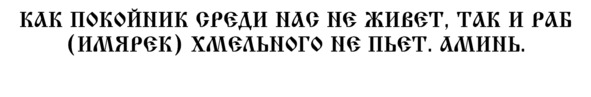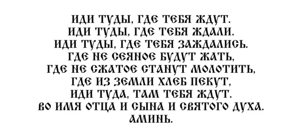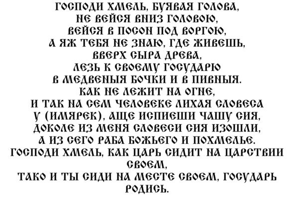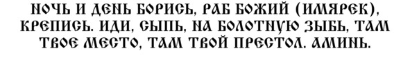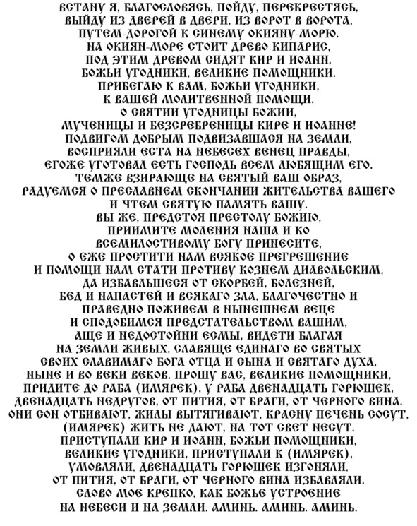 Данный заговор предназначен для использования женой человека, страдающего алкоголизмом. Его необходимо произносить каждый день на протяжении запойного периода. Заговор следует читать на наволочку, которую затем надевают на подушку, на которой спит страдающий алкоголизмом. Утром наволочку следует снимать, стирать и просушивать, а вечером снова надевать на подушку после повторного прочтения заговора. Перед прочтением заговора сложите наволочку 12 раз, поднесите ее прямо ко рту и произнесите текст заклинания.