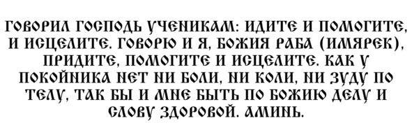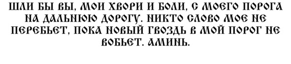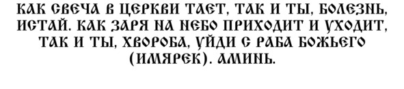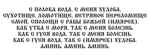 Эти слова следует произнести во время мытья в бане или ванной, на последнем этапе обливания водой. Повторяйте их трижды, каждый раз подразумевая желание излечиться и восстановить полное здоровье.