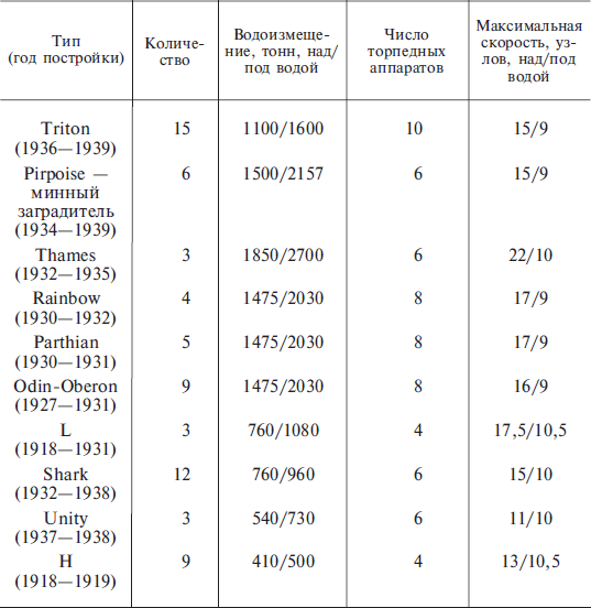 В распоряжении у англичан имелось такое же число подводных лодок, каким располагали германские военно-морские силы, то есть 57 единиц. Однако если считать лодки, готовившиеся к сходу со стапелей к началу войны, то их было 69. Британский подводный флот отличался недостатком единообразия (10 различных типов). Он состоял прежде всего из лодок типа Triton водоизмещением 1500 тонн, три лодки типа River водоизмещением 1850 тонн развивали скорость до 22 узлов и типа О. Лодки типа Н и L устарели к тому времени и были ограниченно годными к применению.