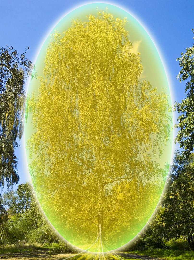 Береза имеет женский тип энергии, но подходит всем без исключения. Это очень доброе и заботливое дерево. Кокон у березы овальной формы, и издали он видится как беловатое сияние. Но подробно изучая энергетику березы, сразу становится заметен салатовый оттенок энергии. Это не чисто яркий салатовый цвет, он смешан с оранжеватой энергией, с примесями прозрачной энергии, как вода.