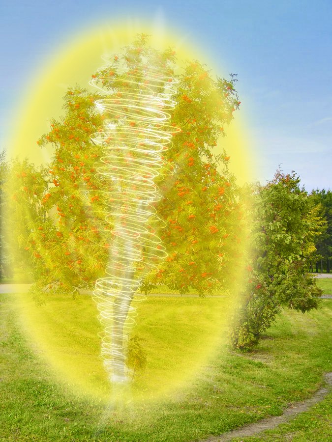 Очень мощное дерево, которое славится защитными и очистительными способностями, помимо осины – это рябина. Энергия рябины настолько хаотична и сильна, что у нее кокон, по сути, и выглядит не как кокон, а скорее как тор – смерч. Это яркий бело-серебристый смерч, который вращается. И вокруг создает желтый слой более легкой энергии, которая скорее летает по инерции и создает легкий ватный слой желтой энергии вокруг основного смерча.