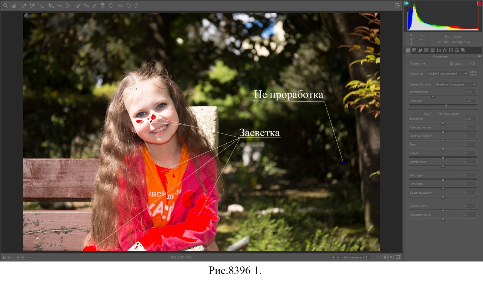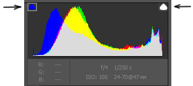 I. Включите на гистограмме значки, расположенные в её верхних углах. На изображении красным цветом показана засветка, синим не проработка при их наличии. Рис. 8396 1.