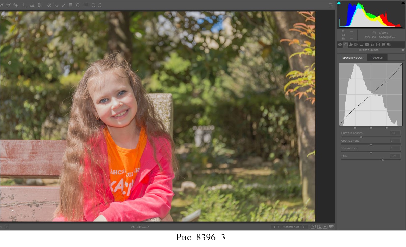 Выполнив коррекцию теней и светов, оцените изображение. При необходимости уточните коррекцию, смещая ползунки экспонирование, белые, светлые области, тени, затемнение. Добейтесь их наилучшего положения. Для файла 8396 оставьте значения параметров без изменения.