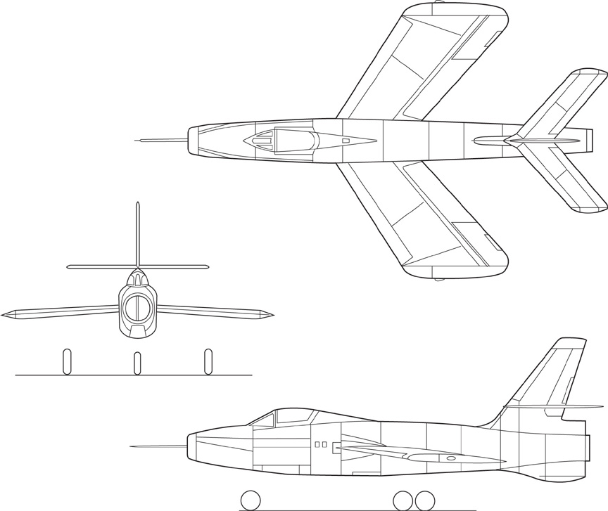 Александр Михайлович достаёт из ящика стола папку с материалами по МиГ-15, которую ему сегодня принесли из секретного отдела и сравнивает его параметры со своим F-84E. Главные отличия: вес конструкции у МиГа почти на две тонны меньше, а нормальный взлётный вес меньше почти на три тонны; тяга двигателя больше на 340кг. Отсюда и скороподъёмность, и максимальная скорость МиГа выше. А его вооружение на едином съёмном лафете снизу воздухозаборника, состоящее из одной пушки 37 мм и двух пушек 23 мм, пожалуй не хуже шести крупнокалиберных пулемётов на его F-84E.
