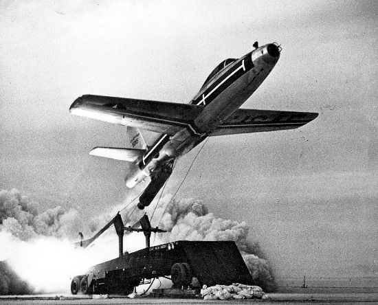 Грузовик привозил платформу с истребителем в заданную точку взлёта и уезжал. Платформу закрепляли домкратами на земле. Пилот занимал место в кабине. Затем конструкция платформы позволяла повернуть на ней самолёт носом вверх под углом в 45 градусов. Пилот запускал двигатель, выходил на взлётные обороты и включал зажигание стартового ускорителя. Он плавно выбрасывал истребитель вперёд и вверх на высоту около двухсот метров и отваливался, а истребитель уверенно продолжал разгоняться на своём двигателе и набирать высоту. Всё это было блестяще продемонстрировано в начале 1954 года.