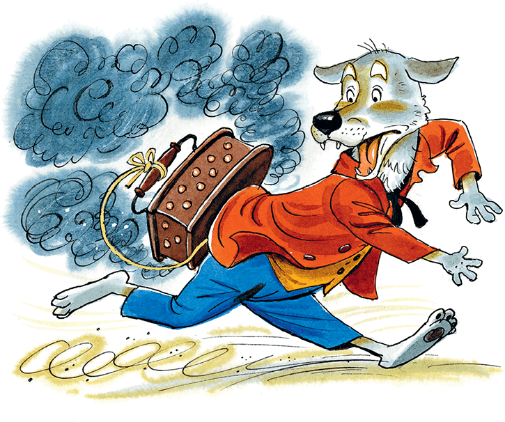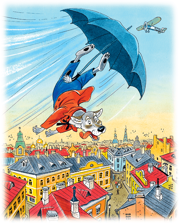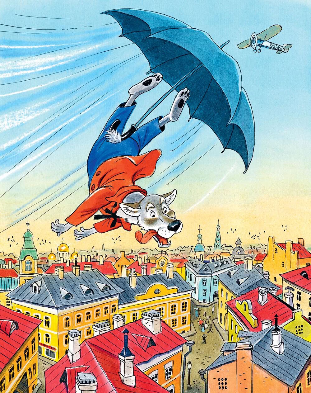 А они-то важничают, а они-то величаются! И опять волк для красоты папиросу в зубы взял, но так как настоящей папиросы с огнём боялся, то взял шоколадную. Только вдруг откуда ни возьмись поднялась сильнейшая буря, прямо ураган, и такой подул ветер, что закружились по земле пыль, сухие листья и бумага. И как подул ветер под большой зонтик, так полетел зонтик вверх и волка за собой потащил через крышу, прямо к облакам.