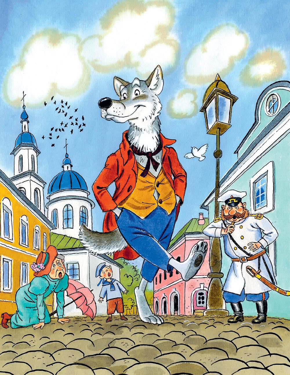 И стали все над волком смеяться: городовой смеётся, лошади смеются, собаки заливаются, хохочут. А дома жена его прогнала и даже не дала ничего поесть, а в тот день у них была манная каша, котлеты и желе – всё очень вкусно. И думает волк про себя, сидит у дверей и думает: