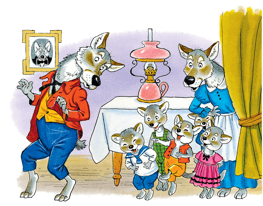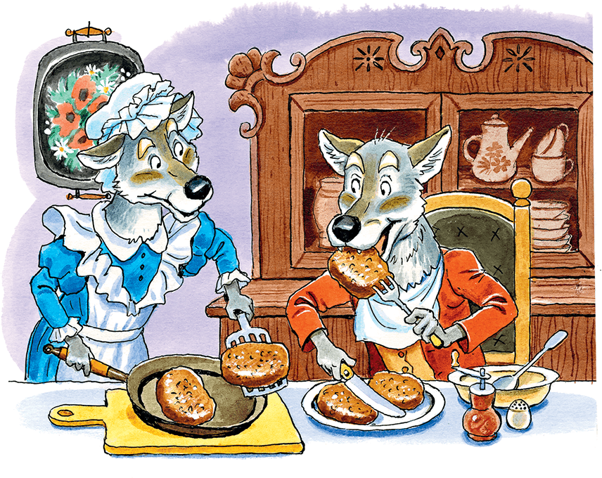 Потом волчиха дала волку хорошо покушать. И так как был он очень голоден, то съел три тарелки каши и десять котлет. А желе ему не досталось: всё его детки поели. И когда накушался волк, вытер салфеткою рот, волчиха и говорит ему: