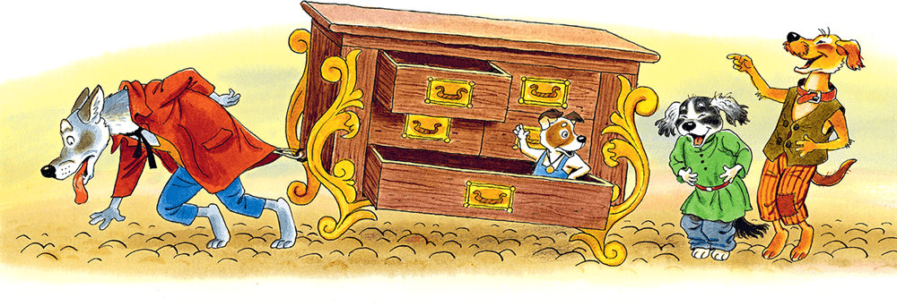 И пришил ему доктор большой деревянный комод. Идёт волк по улице и насилу комод тащит: такой он тяжёлый. Запыхался волк, запотел и думает: «А хорошо было бы, если этот комод оторвался», но только доктор очень крепко пришил, – не отрывается. Тарахтит сзади него по мостовой, как будто целый воз едет.