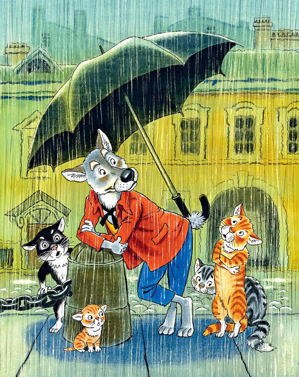 И пришил ему зонтик большой. Идёт волк по улице, зонтик распустил, и такой важный, ни на кого смотреть не хочет. А в это время дождь был, и все мокрые, один только волк сухой. Смотрят на него все и удивляются: