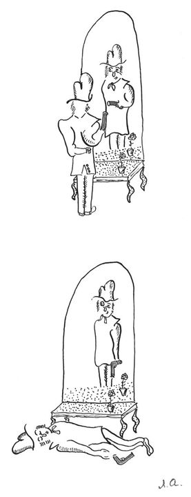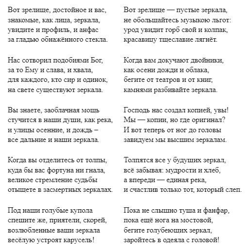 По кругу зеркала, пустынный сад (длиннеющая тень из-за угла) и полудужье солнца за рекой, всё неподвижно, сонно, всё – покой. Не шевелятся листья (всё молчит), как будто время больше не стучит, как будто совершился Божий суд (и мир – фотографический этюд). Но вот метнулась тень из-за угла и полукругом встали зеркала. Осело солнце, перевесив ночь, и тут же представленье НАЧАЛОСЬ.