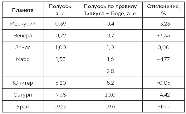 Стоит отметить, что эмпирическое правило Тициуса – Боде получило всеобщую известность именно благодаря Иоганну Боде и по-настоящему всколыхнуло научное сообщество спустя девять лет после выхода его книги, когда было полностью подтверждено открытием седьмой планеты Солнечной системы – Урана. Большая полуось его орбиты была очень близка к предсказанному значению – 19,22 а. е .[6] вместо расчетных 19,6 а. е. (отклонение менее 2 %), а значит, между орбитами Марса и Юпитера просто обязана была быть еще одна планета!