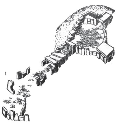 Так, например, на северо-западе Франции в Бретани (на пути древних переселений народов), у основания полуострова Киброн, вблизи города Карнак, находился громадный комплекс каменных культовых сооружений. Рядом с «галерейной гробницей» кургана, обложенного камнями, находится дольмен и могильник, а также огромный полукруг из 70 тесно поставленных камней. К этим сооружениям подходят три аллеи из менгиров, как колонны воинов. Одна из аллей размером 90х1000 метров включает II рядов из 1100 камней. Вторая аллея 100х180 метров составляет 10 рядов из 1000 камней. Третья размером 130х820 метров имеет 13 рядов из 820 камней. Высота менгиров в аллеях увеличивается по мере приближения к основным сооружениям гробницы с 0,6 до 3,7 метра. Все три аллеи ориентированы в направлении северо-восток юго-запад. Эти каменные ряды напоминают построенные войска, производя ошеломляющее впечатление.