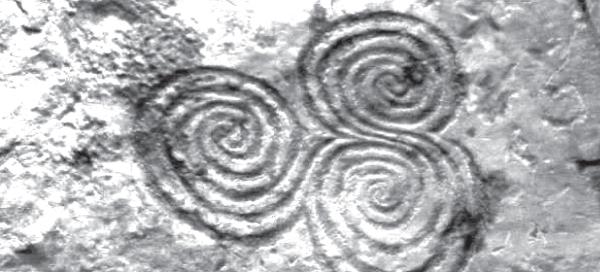 Гигантский длинный курган Нью Грандж в Ирландии (1) почти полностью повторяет сооружения на берегу Португалии, и черноморские дольмены, но в Нью Грандж высота Центрального зала 6 м, три погребальных камеры перекрыты многотонными каменными плитами, все камни галереи и камер (2) покрыты рисунками, один из которых (3) – сложная спираль – встречается особенно часто.