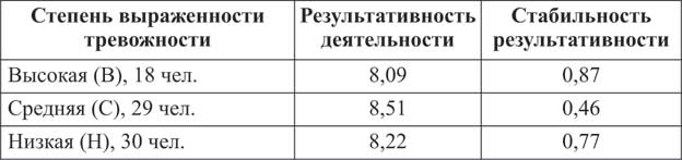 Результативность деятельности оказалась самой высокой в группе спортсменов со средней степенью тревожности – 8,51 балла. В этой же группе самый незначительный разброс результатов в серии соревнований – 0,46, т. е. стабильность результатов самая высокая. По сравнению с эффективностью деятельности спортсменов этой группы менее результативными оказались как спортсмены группы с высокой тревожностью, так и спортсмены группы с низкой тревожностью. И повышение, и понижение степени тревожности по сравнению с ее средним уровнем приводит к снижению и результатов деятельности, и стабильности в экстремальных условиях.