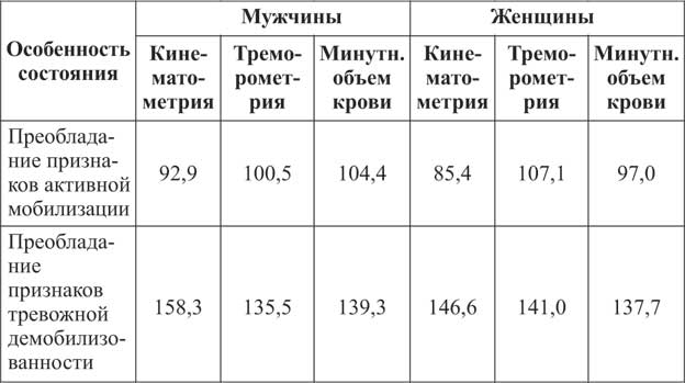 Таблица 4. Показатели состояния у спортсменов с различными соотношениями признаков мобилизации и демобилизации (% к фоновым данным)