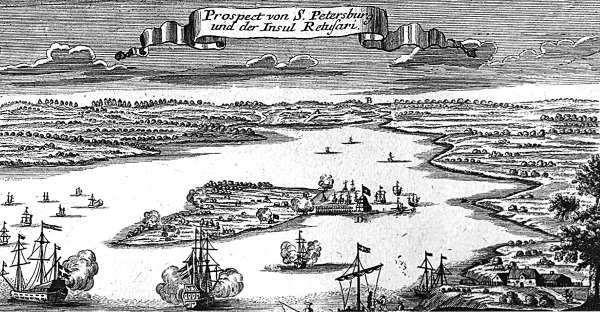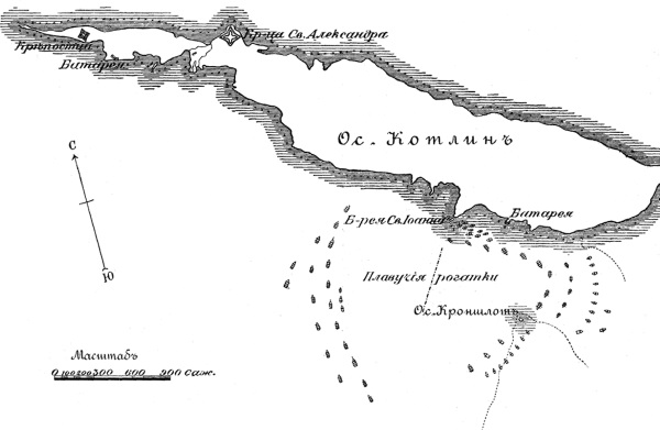 От этого места, как уже упомянуто, начинается открытое море, или Финский залив; вследствие чего его царское величество и назначил быть здесь морской крепостце, которая заложена, если не ошибаюсь, в 1704 году под именем Кроншлота. Этот Кроншлот выстроен между Ингер-манландской стороной и сказанным островом Ретусари, на песчаной отмели середи моря, с целью преградить свободный доступ в Неву реку. Он имеет вид круглой башни в три яруса, которая вооружена снизу до верха пушками, и в нем, как летом, так и зимой, находится постоянный гарнизон. Мне сказывали, что этот форт сооружен русскими и что фундамент его сложен из ящиков с каменьями, которые были погружены в воду зимой. Строение в нем деревянное и земляное; на вершине башни развевается большой флаг. Мысль форта не дурна; однако смышленые головы толкуют, что неприятельское судно, которое вздумало бы двинуться на всех парусах к реке, не много встретило в том помехи от упомянутой крепостцы, потому что из круглой башни нельзя делать по кораблю за раз более двух или трех выстрелов, тогда как, если бы крепостца имела форму треугольника, то с нее можно было бы залпами, из десятидвенадцати выстрелов, успешнее задерживать проходящие суда и совсем их истреблять»[46].